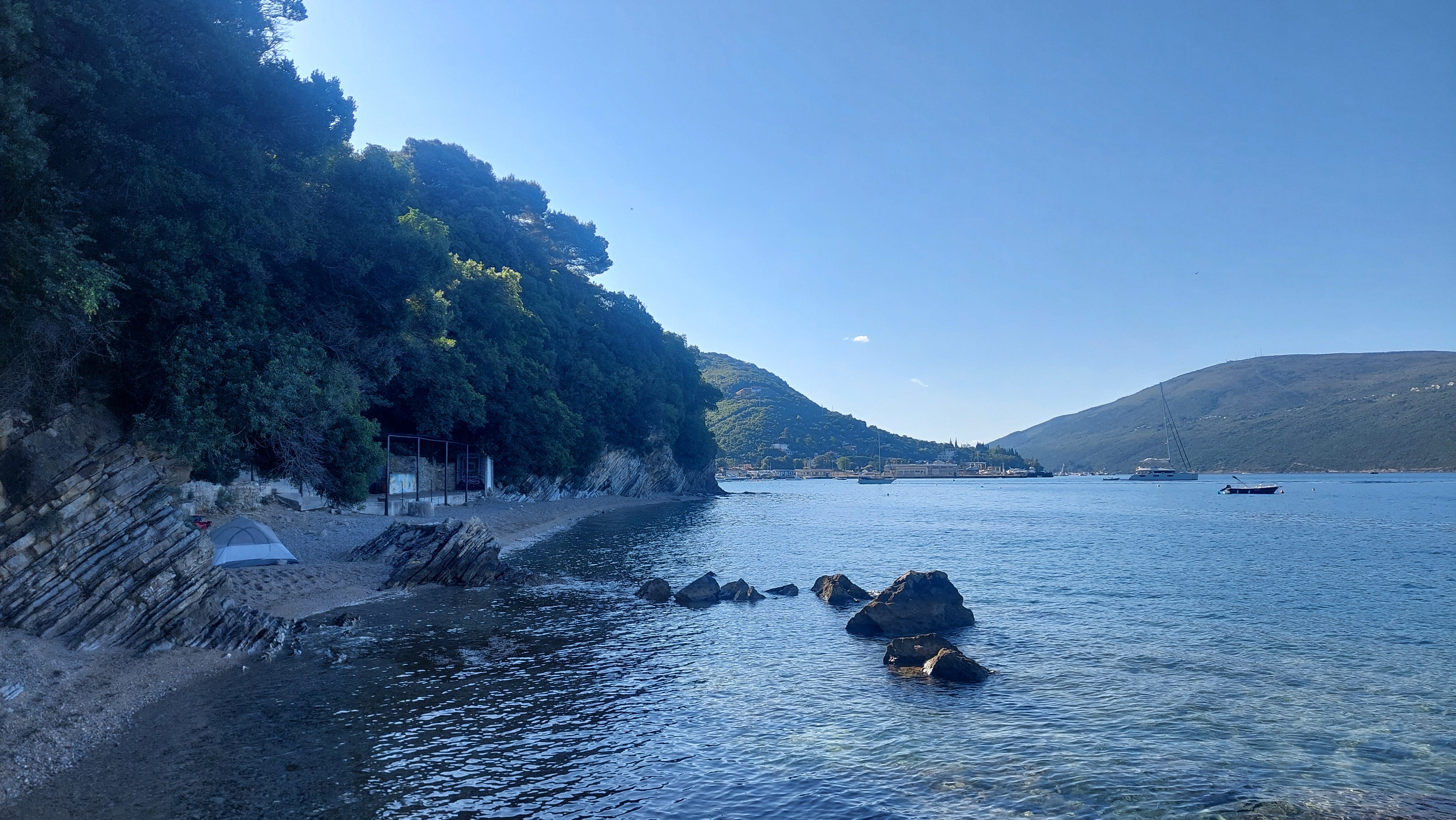 Pentru restul serii, modificăm radical programul - nu mai ocolim întregul golf (deci ratăm Perastul, altă bijuterie a zonei), ci apucăm direct spre Tivat, să trecem cu feribotul marea. Scurtăm astfel vreo 40 de kilometri și punem și mersul cu barca în palmaresul experienței - de pe apă totul se vede altfel, mai magic.