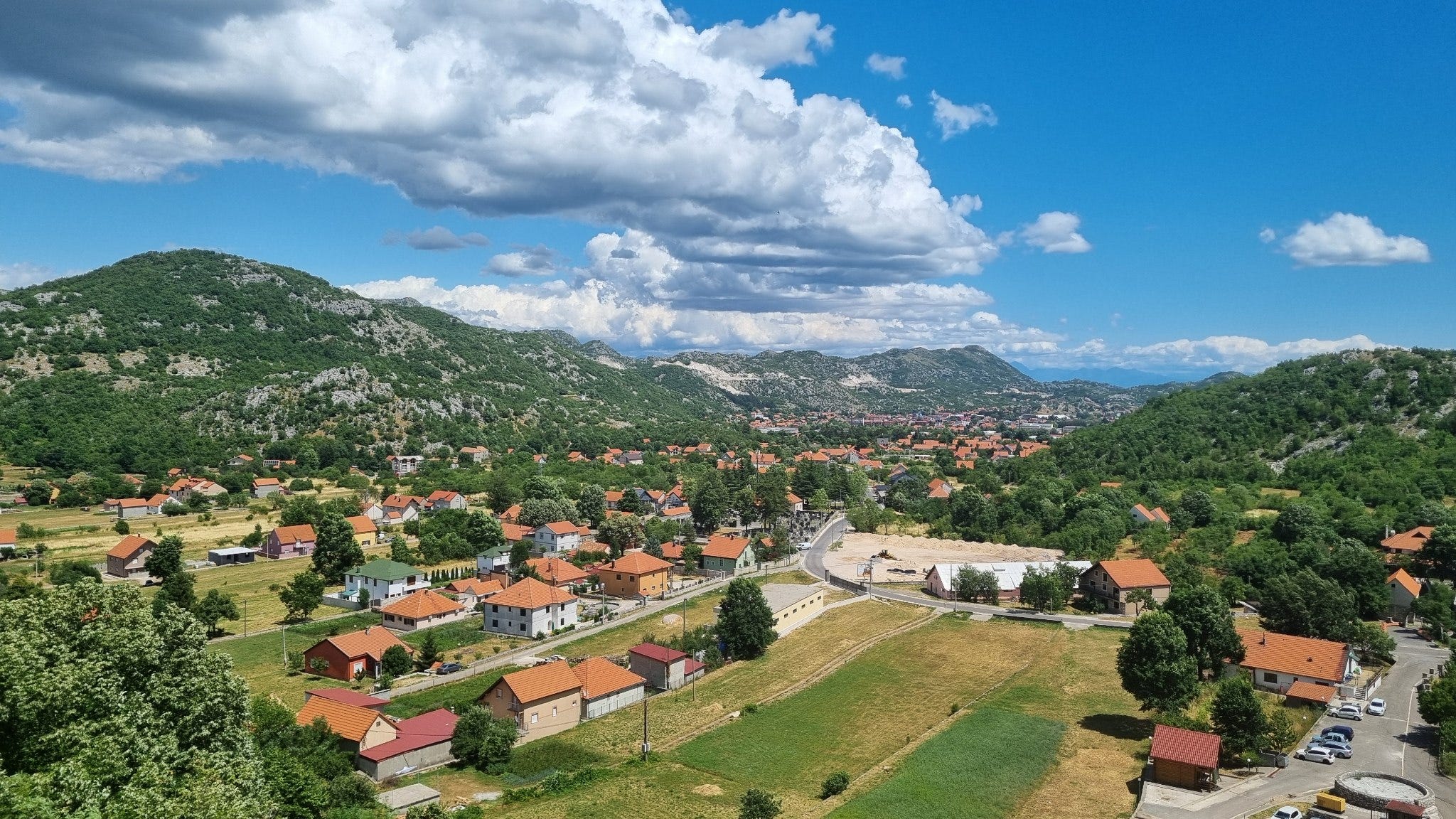 Dimineața mai poartă încă urmele furtunilor anterioare, dar și semnele unei zile caniculare. Urcăm și coborâm constant, dar totuși mai mult urcăm, pe o șosea ca în palmă, dar aglomerată. Când sosim la Cetinje, suntem obosiți din cale afară - tragem în parcul fostei ambasade austro-ungare în Muntenegru să ne revenim - Elisa chiar fură un pui de somn pe o bancă, în gălăgia unor copii care mai știu încă să se joace și afară.