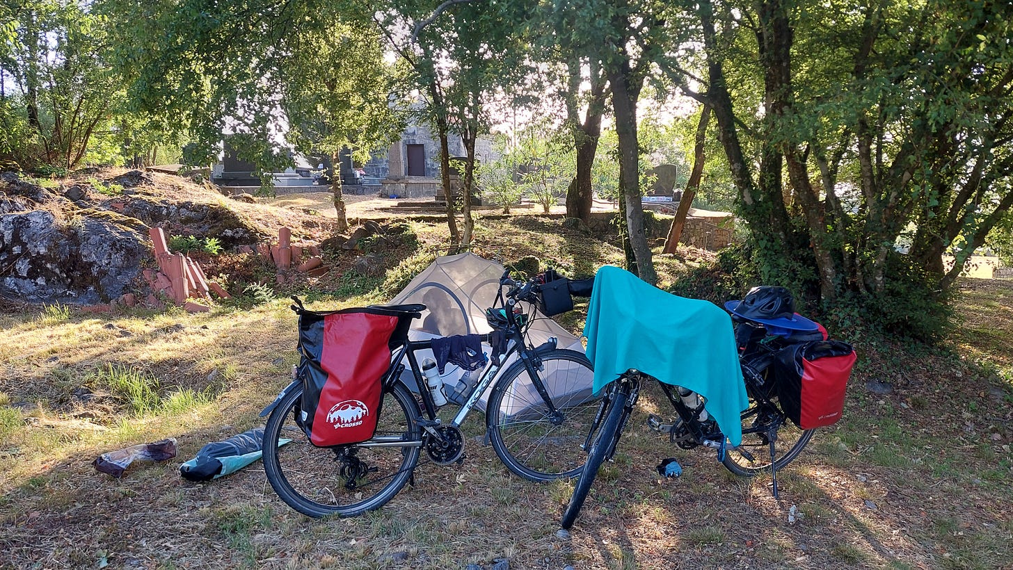 Pe celălalt mal totul este turistic, stațiunile se înșiruie una după alta, fără niciun moment de respiro unde să ne întindem și noi cortul. Găsim o sursă de apă la un cimitir (nota bene: cimitirele chiar sunt locuri prietenoase pentru cicloturiști) și, aproape de apus, descoperim și o plajă pustie și retrasă, pe care coborâm cu bicicletele. Am găsit locul perfect! Nisip, mare, pădure și liniște. Și, în ciuda vântului cam puternic, ne declărăm mulțumiți: facem baie sub lumina lunii, mâncăm pe cinste din tot ce avem prin bagaje și încercăm să ne odihnim, atât cât putem din cauza oamenilor care mai trec, până dimineață.
