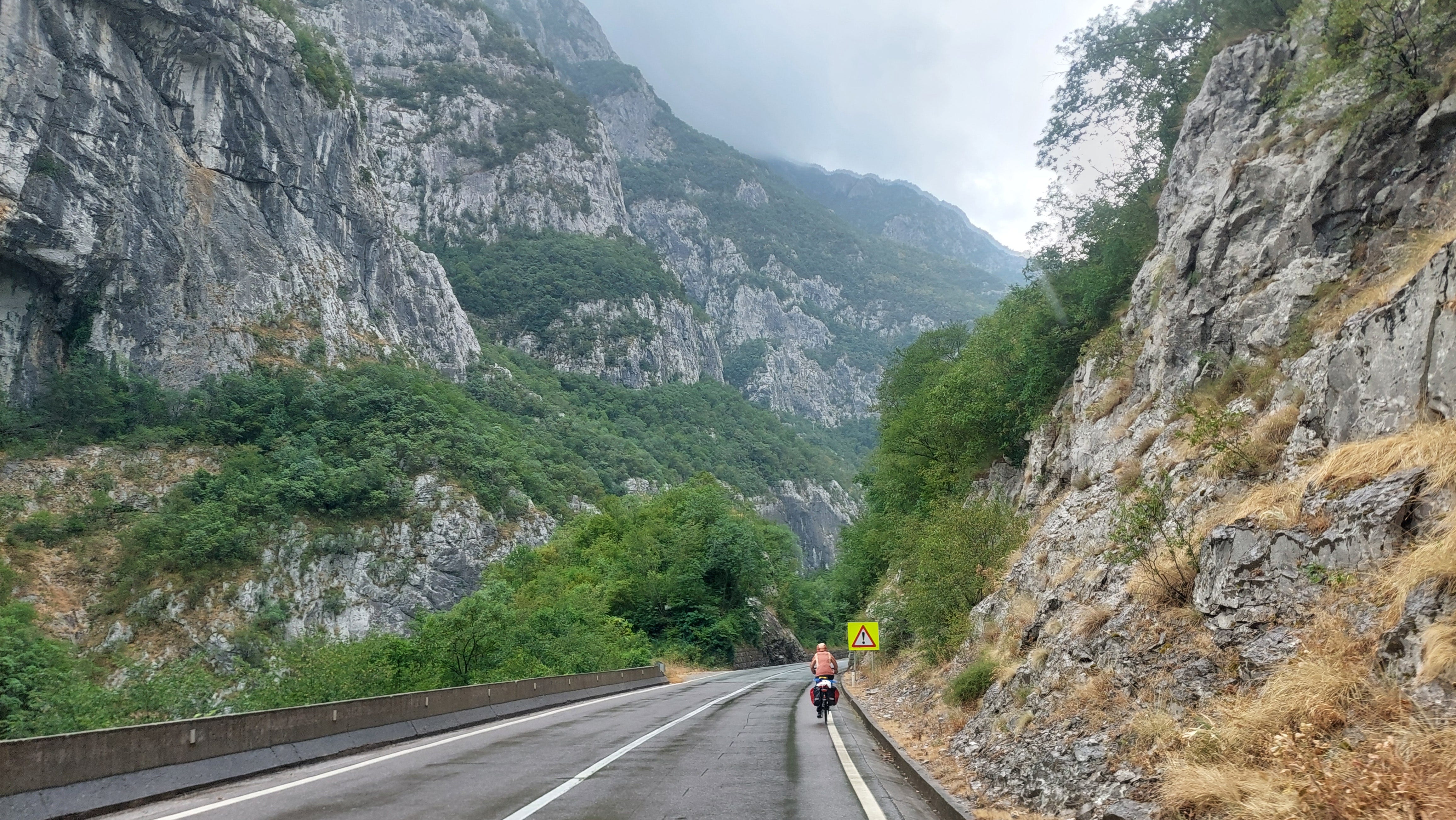 A doua zi, pe lângă urcare, mai adunăm niște adversitate: plouă rar în Balcani, dar noi suntem norocoși să prindem exact acele zile în șa. Și, deși prognoza anunță potopul mai după amiază, el începe dinainte de prânz, fără să apucăm să ajungem nici măcar la Kolașin. De aici, totul este un hazard: când plouă, când se oprește, când găsim unde să ne adăpostim, când luăm ruperea de nori în plin. Însă cu cât pierdem din altitudine, adâncindu-ne în canion, cu atât vremea se face, totuși, mai bună.